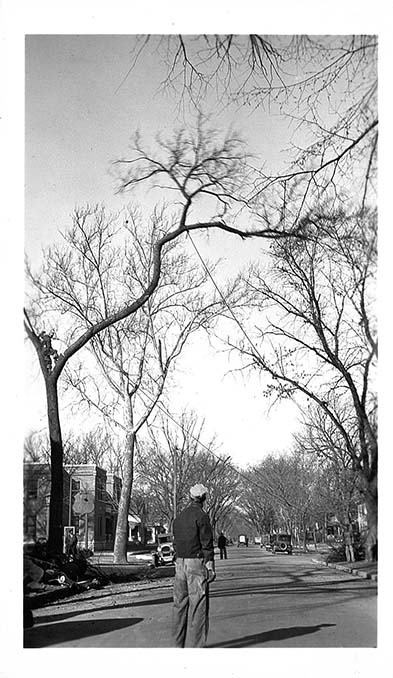 Tree limb falling with the removal of dead tree in front of Elks Club, Houston St, Manhattan, KS, March 11, 1936