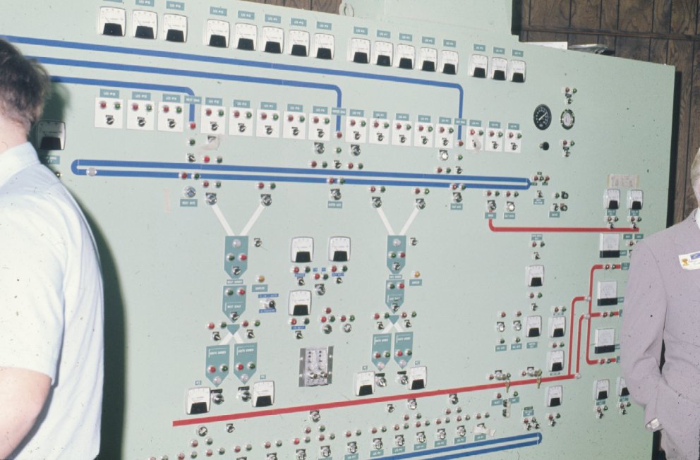 Before view, new operating control panel in new office at base of headhouse. See gp033 for after view.
