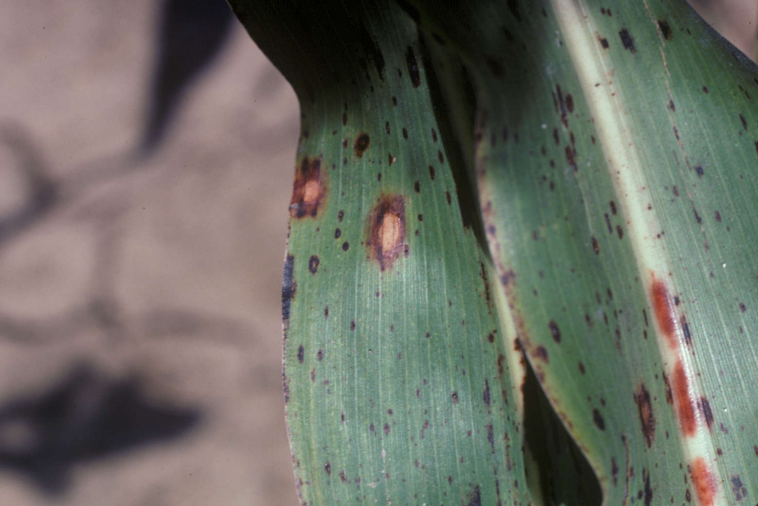 Characteristic lesions. Red lesions on midrib are caused by a Cercospora sp.