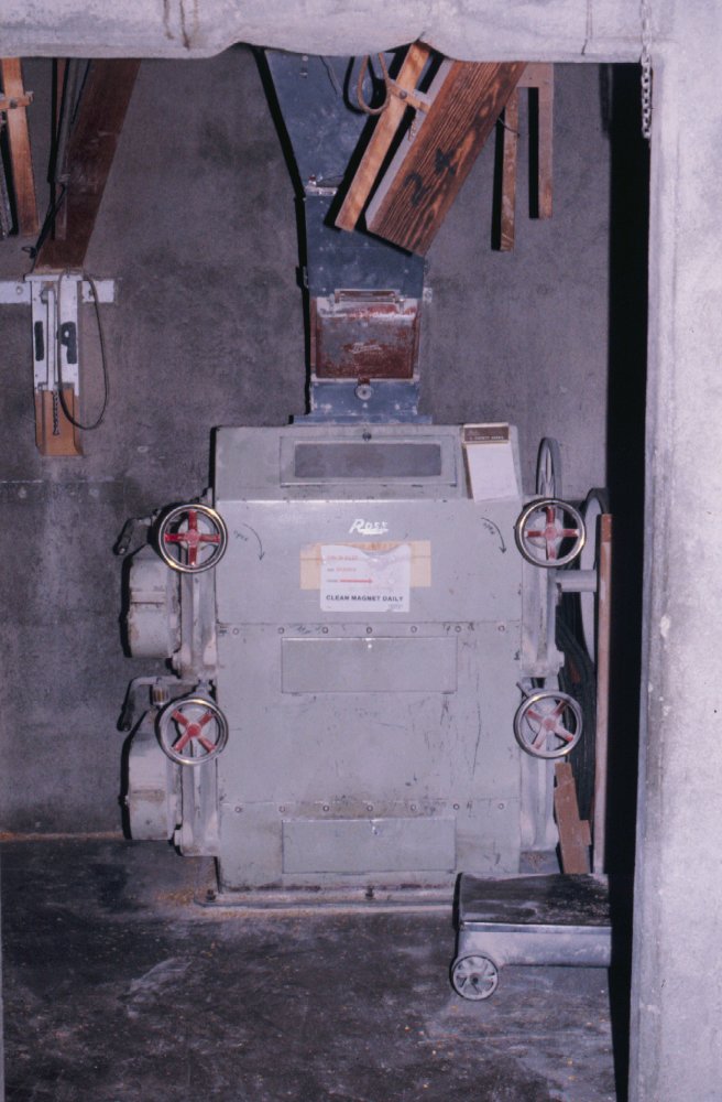 Closer view of roller mill operator was going to check for strange noise when primary explosion below the mill shot a fireball back through the mill cover, burning the operator's hands and face and catching his clothes on fire.