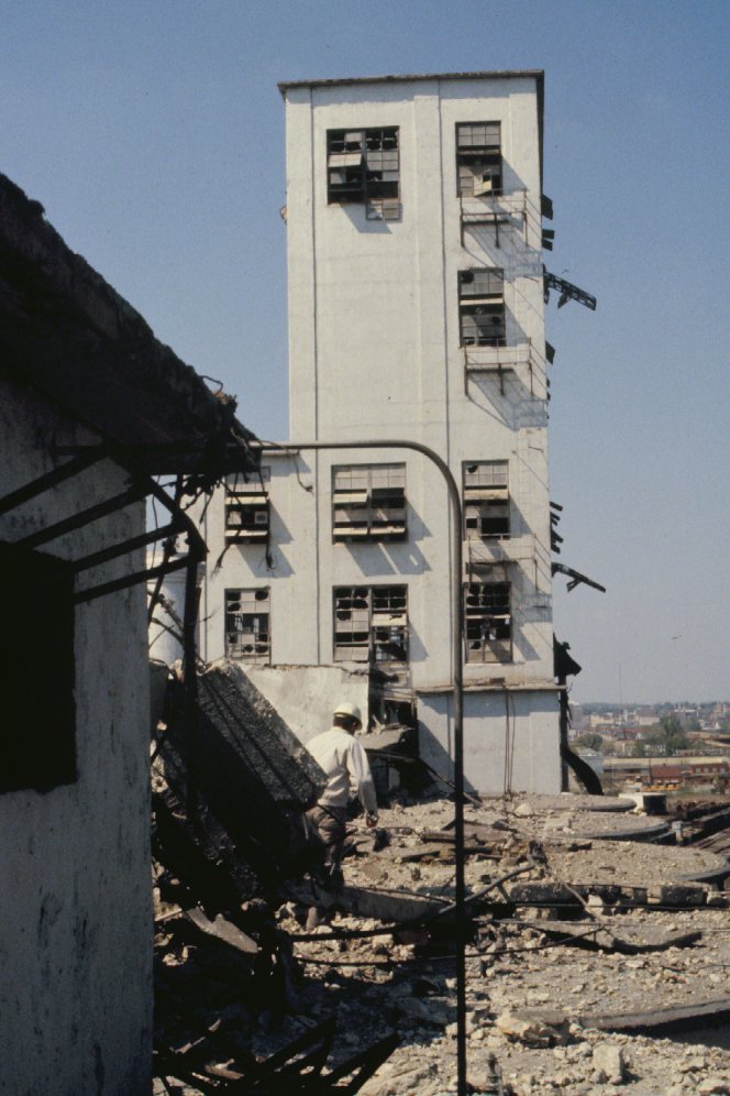 Destroyed gallery and debris on silos tops.