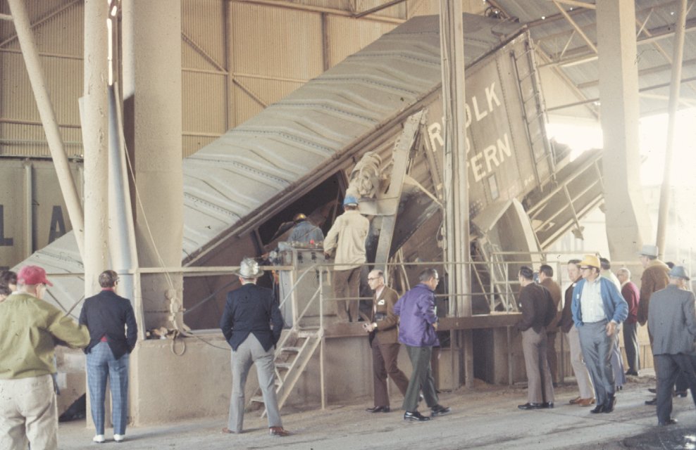 Photo prior to explosion showing mechanical unloading of box car. See Goodpasture 074 for image after explosion.