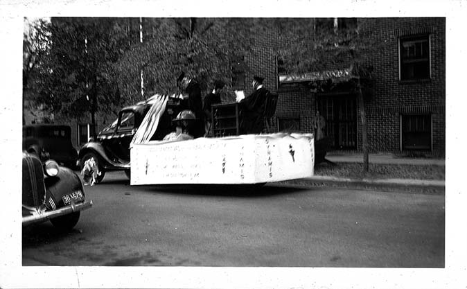 Dynamic Professor Mudge, Ward, and Shelton float, 75th Anniversary Parade, Manhattan, KS, October 29, 1938