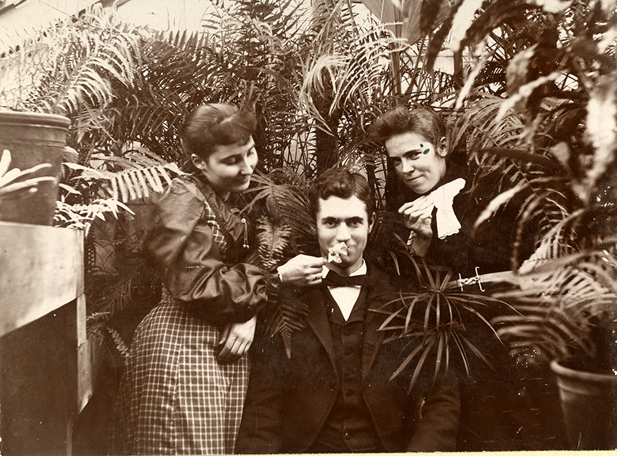 Two female students playfully tease a male student inside one of K-State's greenhouses next to Horticulture Hall.