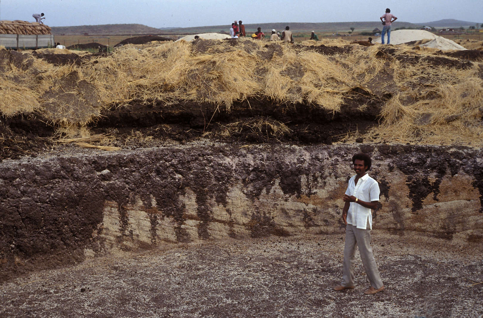 Wad Medani, Sudan: A man standing in a storage facility prior to having sorghum grain deposited. Other storage units are in the background.