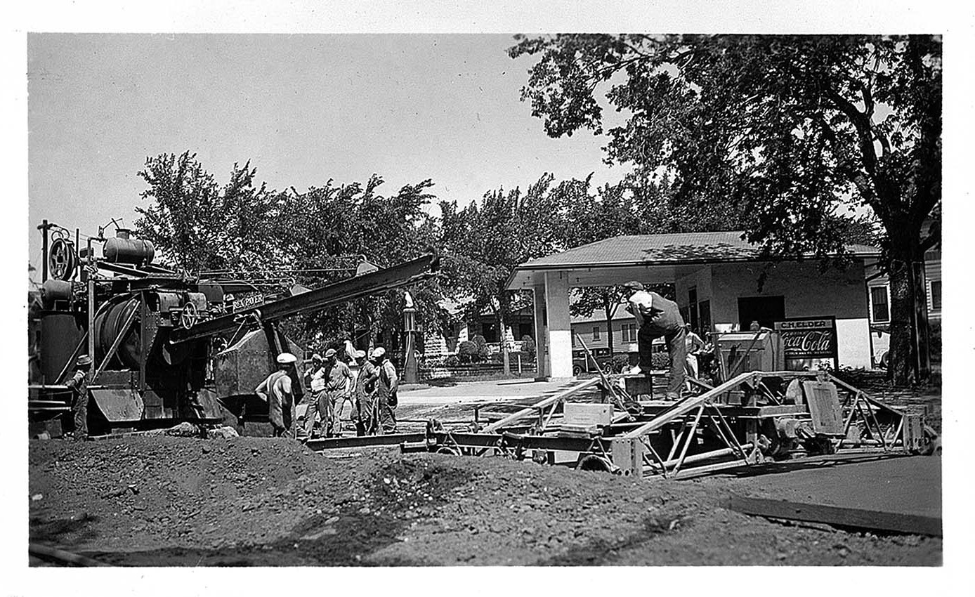 Construction workers using large cement paver at Poyntz Ave and Seventeenth St, Manhattan, KS, May 30, 1934