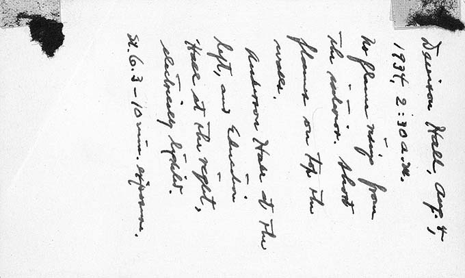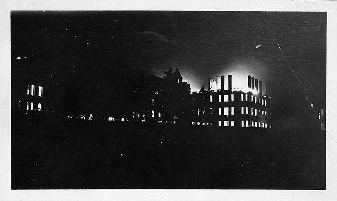 Denison Hall on fire at 2:30am with Anderson Hall on the left and Education Hall on the right