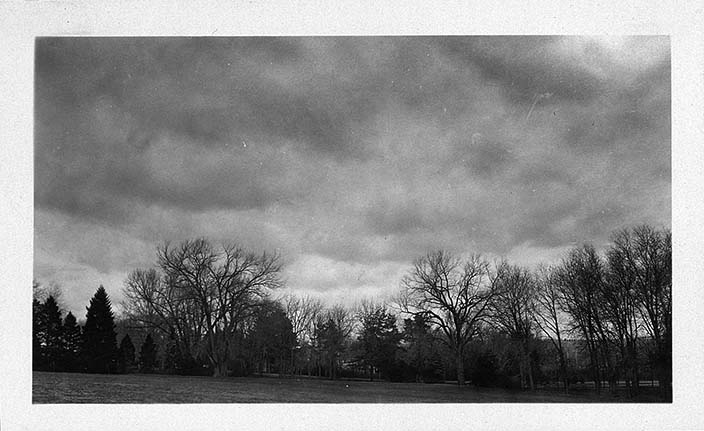 View of trees and the president's residence in the background from Thompson Hall