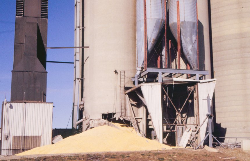 Corn from ruptured concrete silo and damage to truck receiving shed.