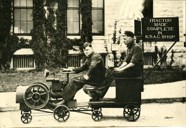 Two students sit on a miniature tractor constructed in the K-State shops (present-day Seaton Complex).