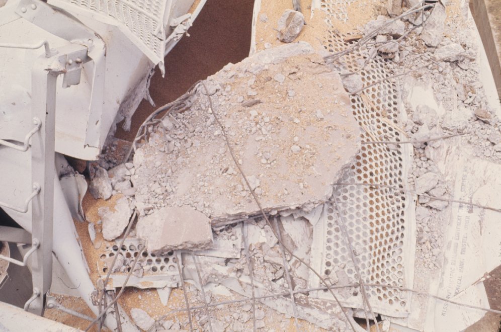 Closer view of damage to two hopper cars from falling concrete from headhouse 250 feet away.