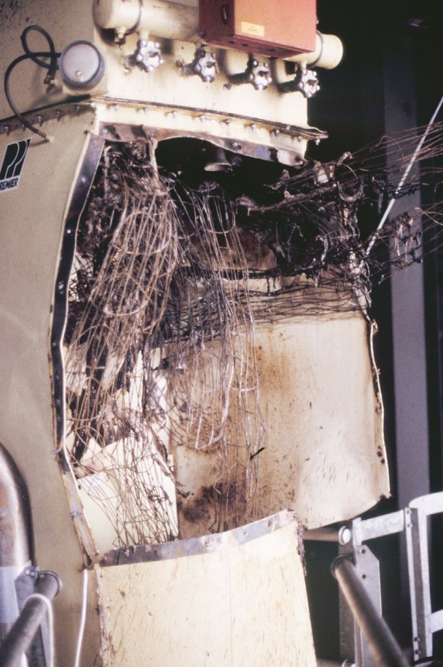 Severe damage to bag filter on top of holding bin for bagging.