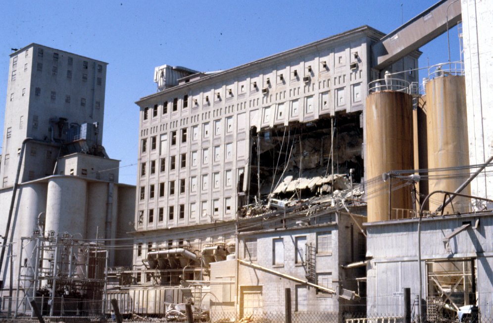 Wall blown out on east side of flour mill by secondary explosion in dust collector.