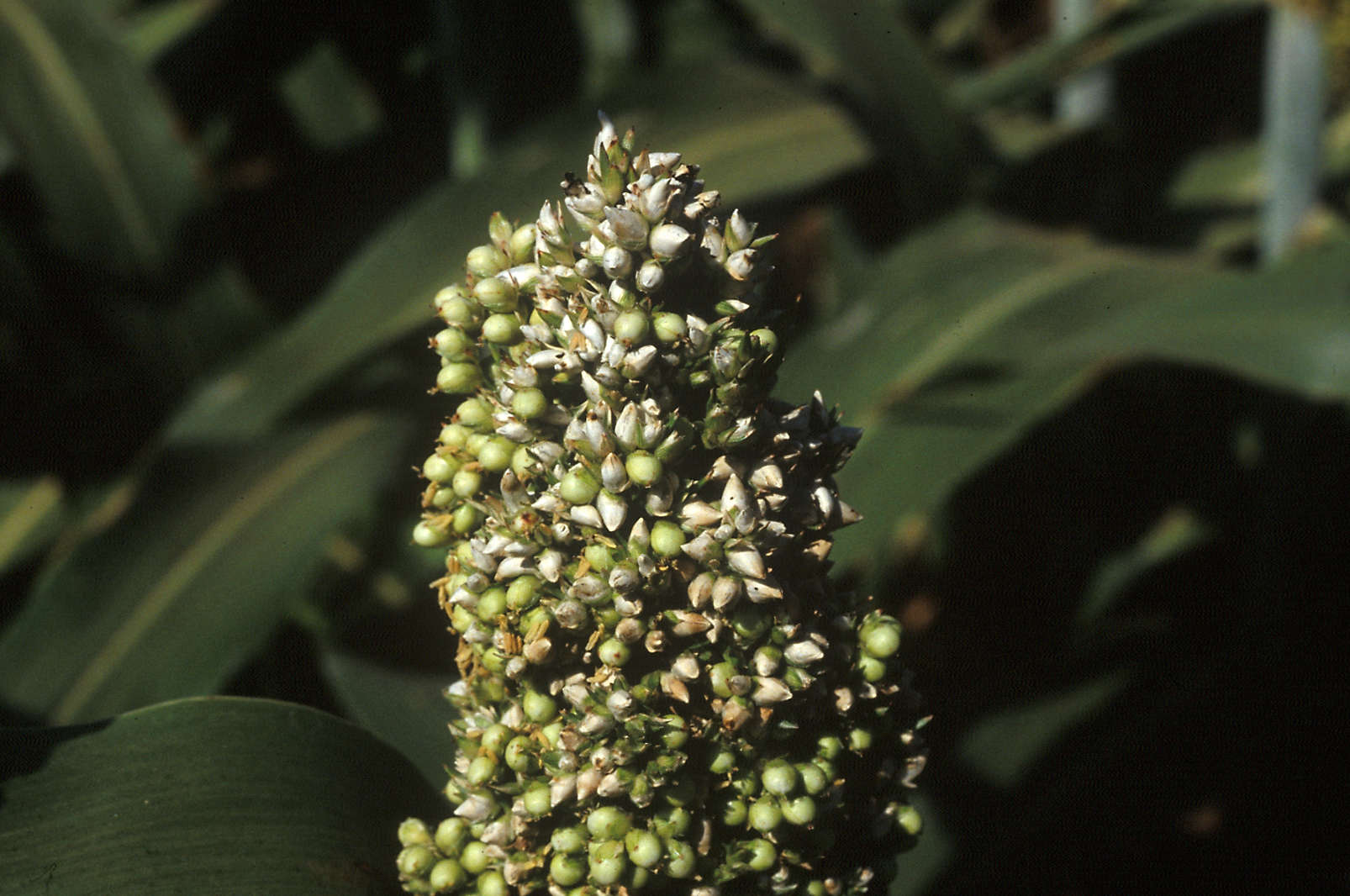 Sudan, Wad Medani: Covered kernel smutted plant in Sudan. Covered kernel smut is found in most sorghum growing areas. Only a portion of kernels are replaced by smut in this panicle.