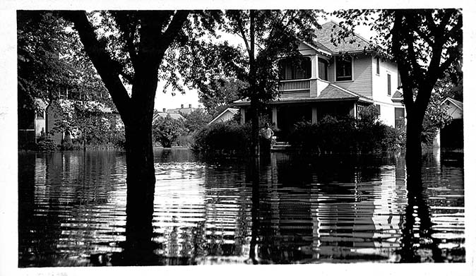 Henry Otto in front of his Residence surrounded by flood waters, 1207 Houston St, Manhattan, KS, June 4, 1935