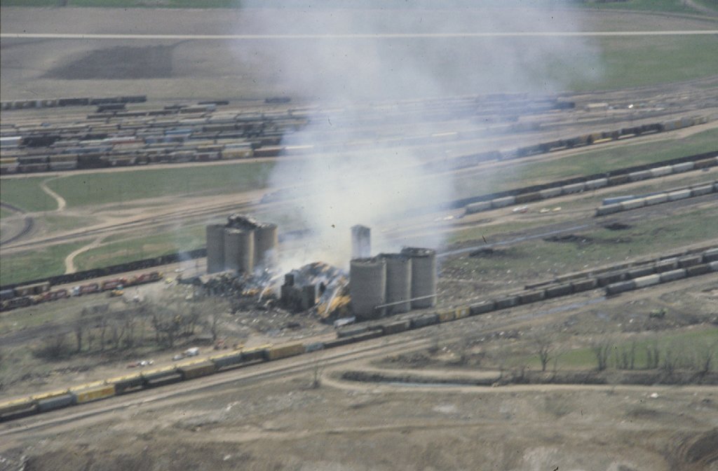 Aerial view of elevator the next day with smoldering fires.