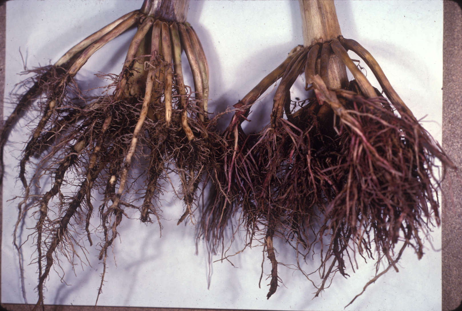 Root symptoms of a stunt nematode infected plant. Healthy roots on left.