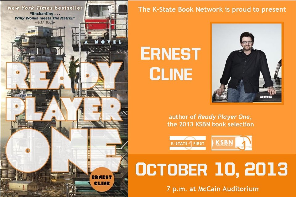 A poster advertising an author talk by Ernest Cline at Kansas State University on October 10, 2013. Ernest Cline's book "Ready Player One" was selected as the 2013-2014 common book.