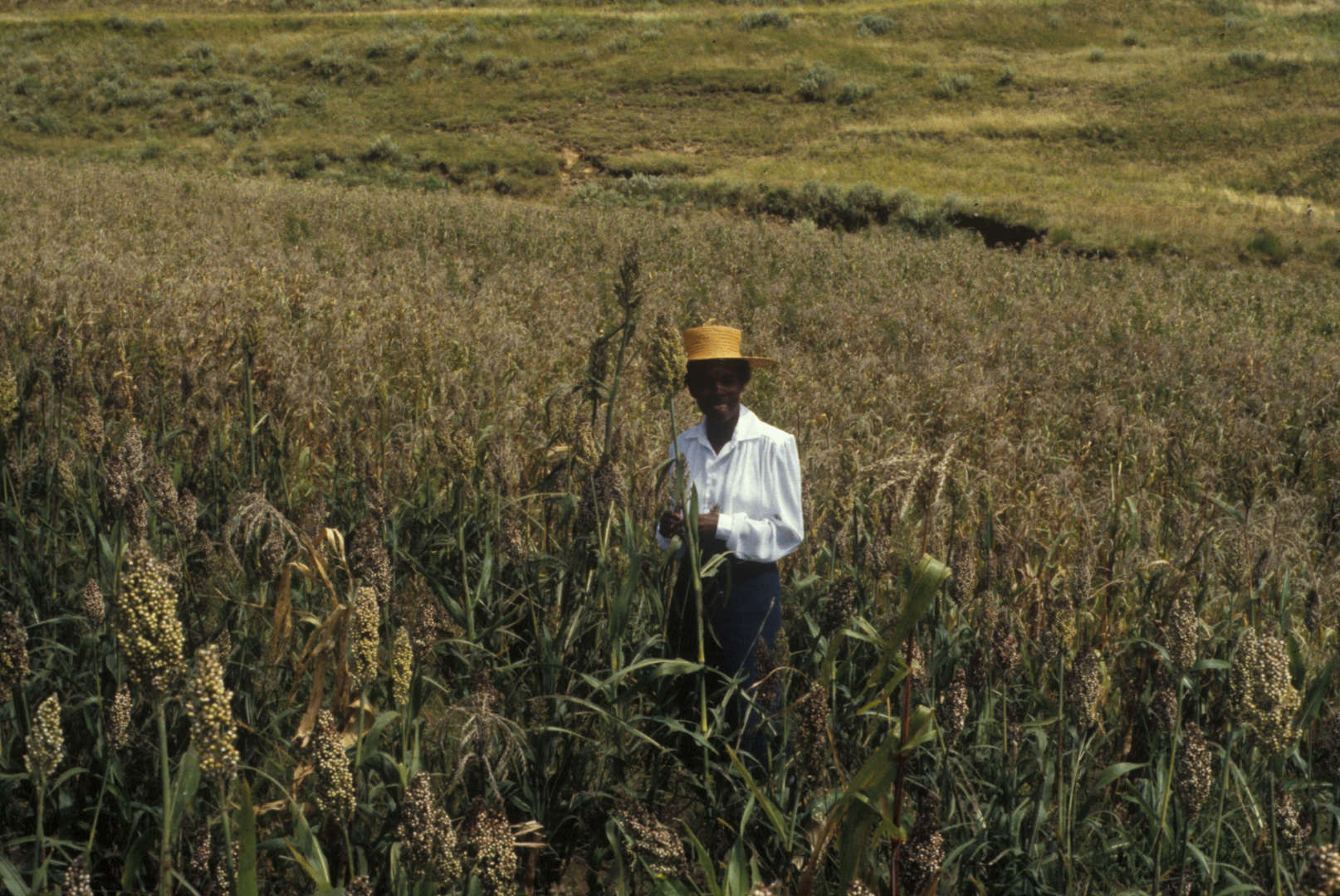 Farmer in Lesotho surveying sorghum planted on a steep hillside.