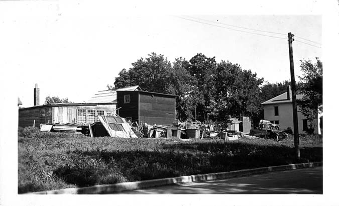 Junk yard at Poyntz and Manhattan Ave, Manhattan, KS, with trees and house in the background, June 20, 1937