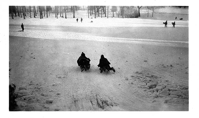 Snow sledding on the east side of Kansas State Agricultural College Auditorium