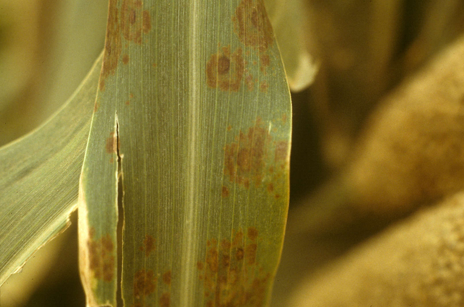 Similar to dactuliophora leaf spot. Occurs on maize, millet, sugarcane and other grasses.