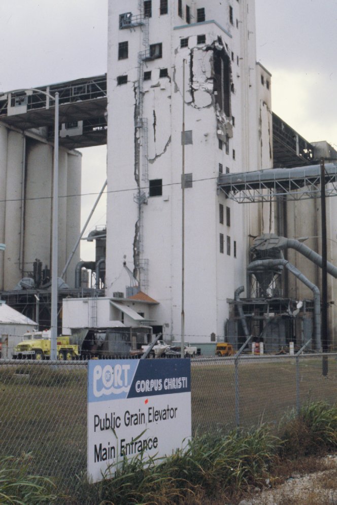 Identifying sign and headhouse damage after a series of dust explosions. Experts documented as many as twelve explosions.