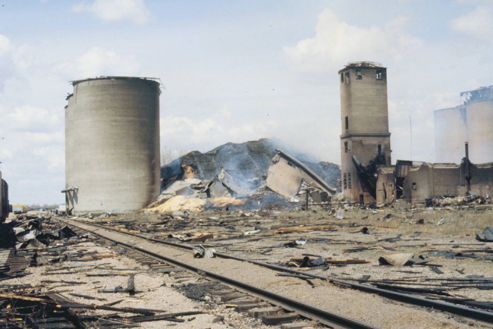 Wood elevator destroyed; large pile of grain and wood still on fire - Note wood debris several hundred feed from the elevator.