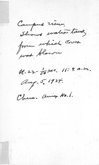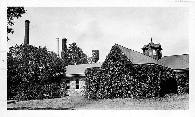 View of water tank with cover off and engineering stacks behind the chemistry building