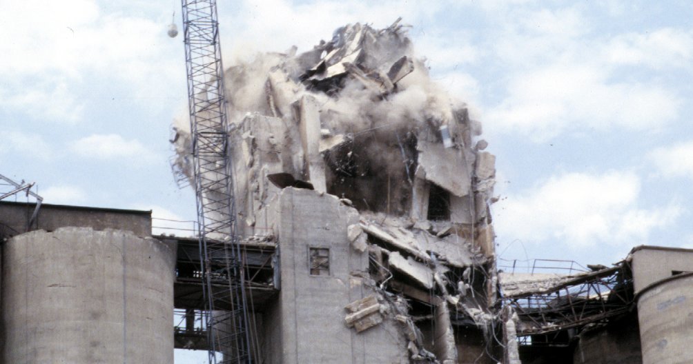 Demolition; top 40 feet is falling away to the west side, sparing the crane operator.