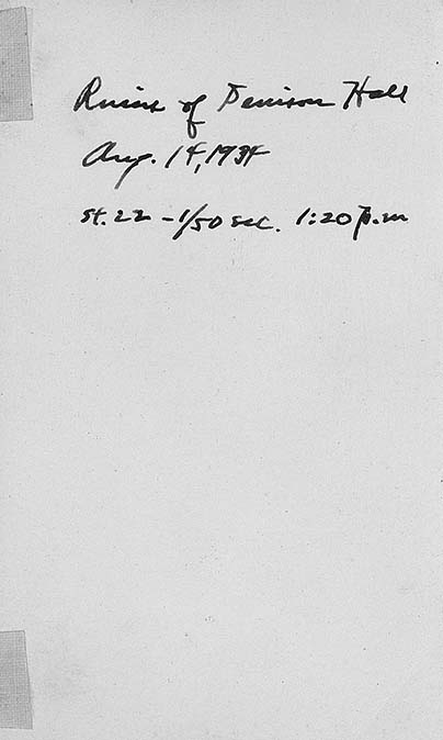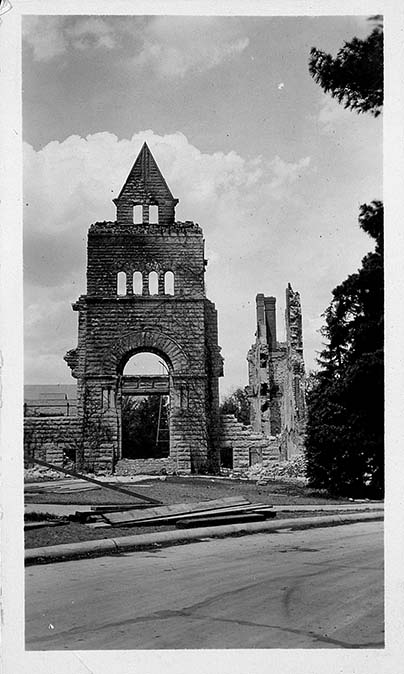 Partially torn down Denison Hall ruins with front entrance still intact