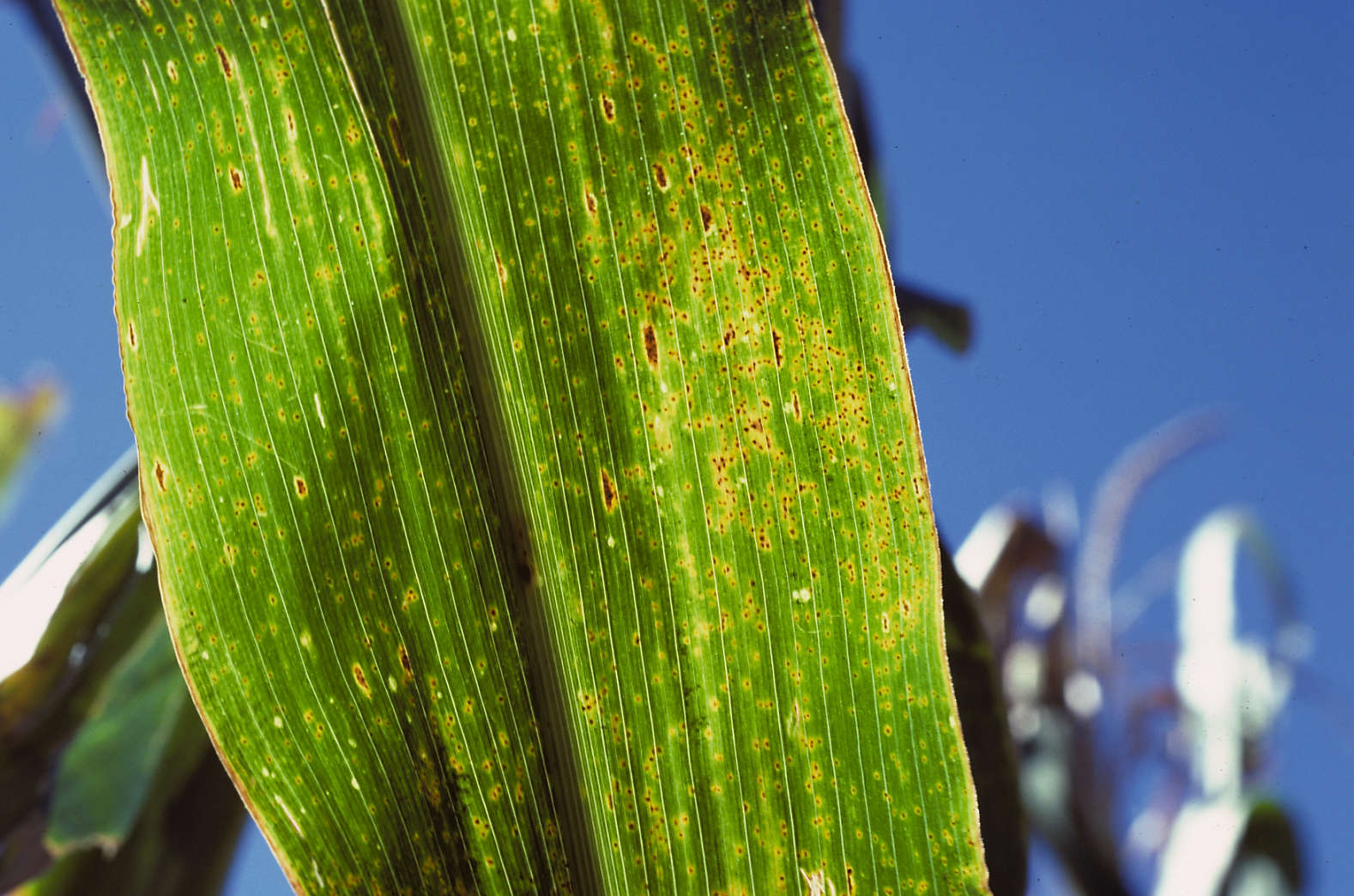 Initial symptoms are chlorotic flecks and small cinnamon colored pustules.