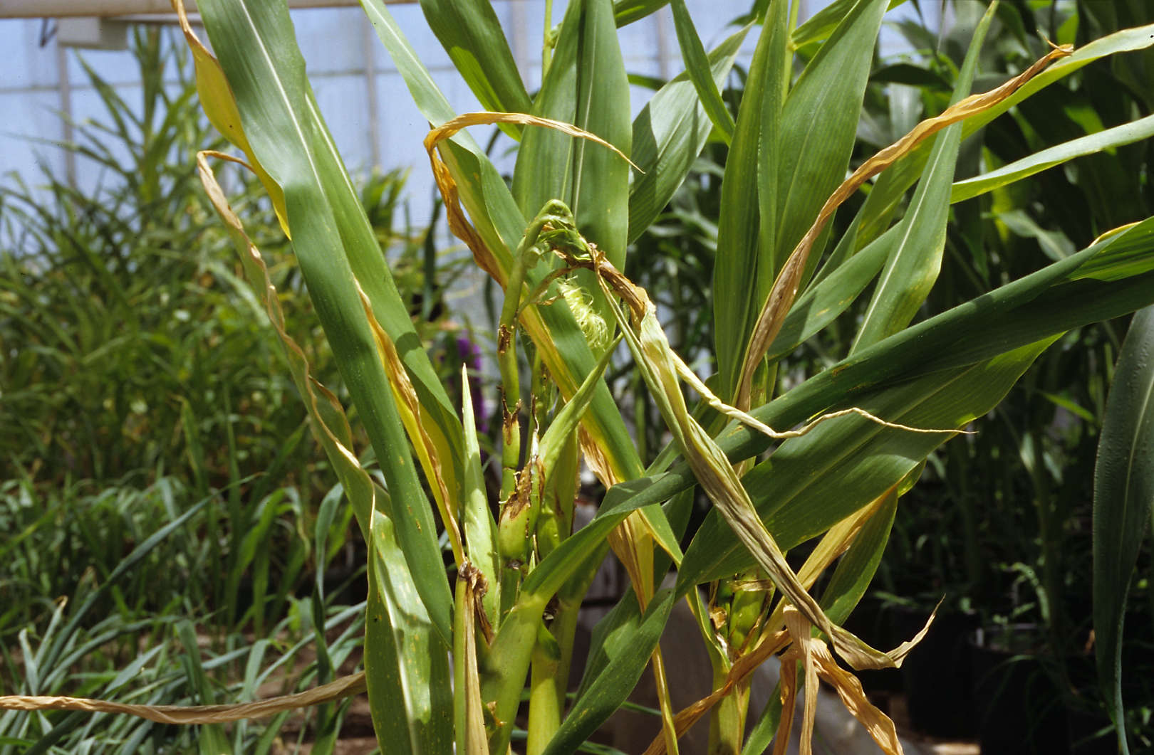 Twisted top appearance of corn plant.