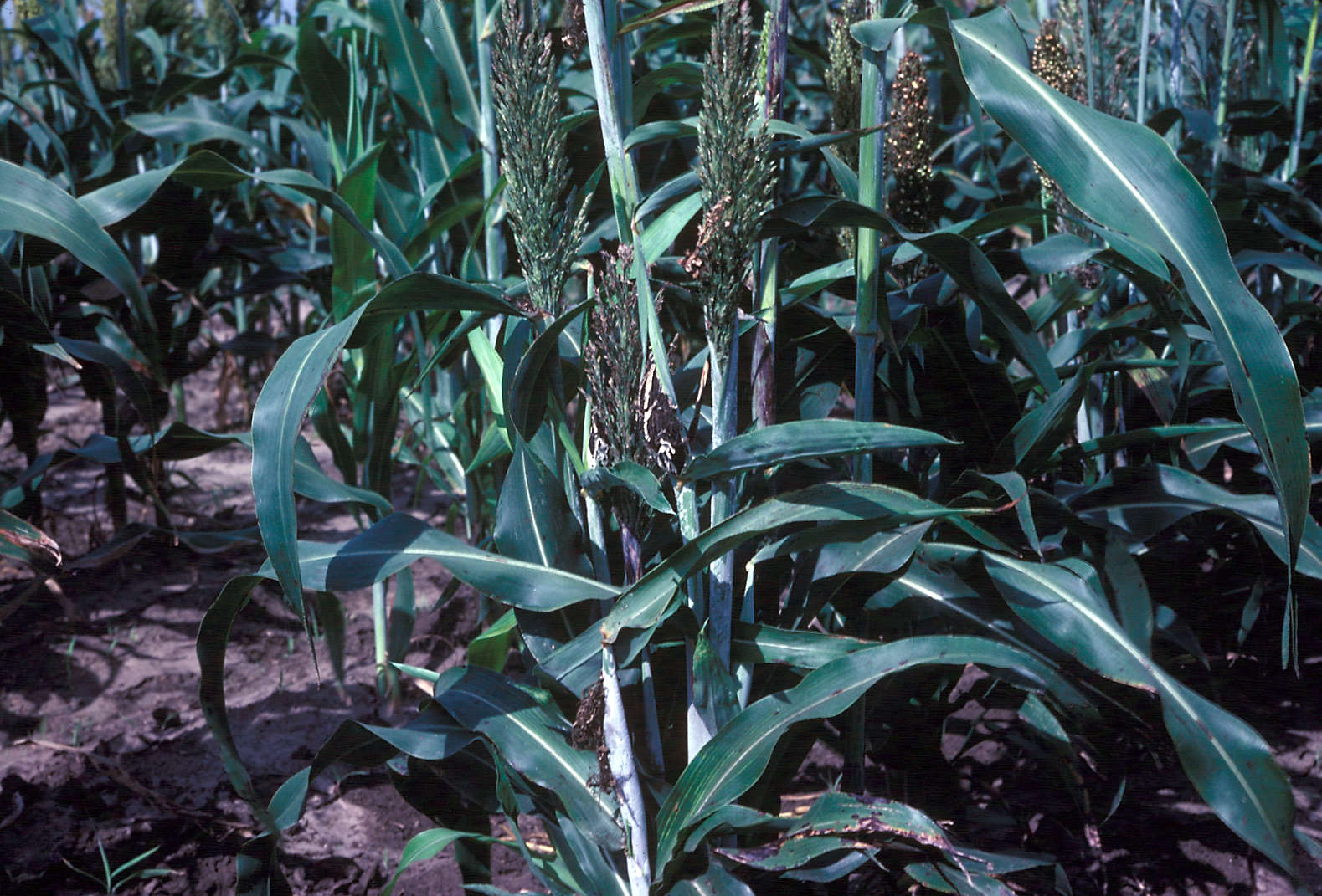 Head smutted plant among healthy sorghum plants.
