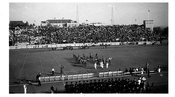 High school band performing at K.S.C. versus University of Oklahoma football game on Homecoming Day, October 30, 1937