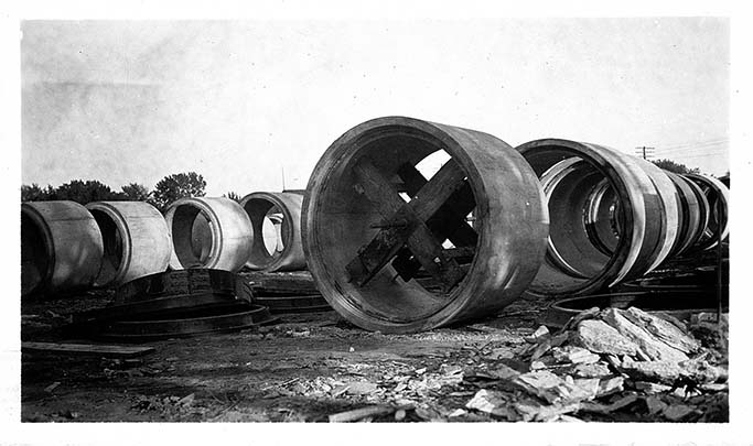 Sewer pipes at yard where made and appliances to transport them, Manhattan, KS, September 30, 1934
