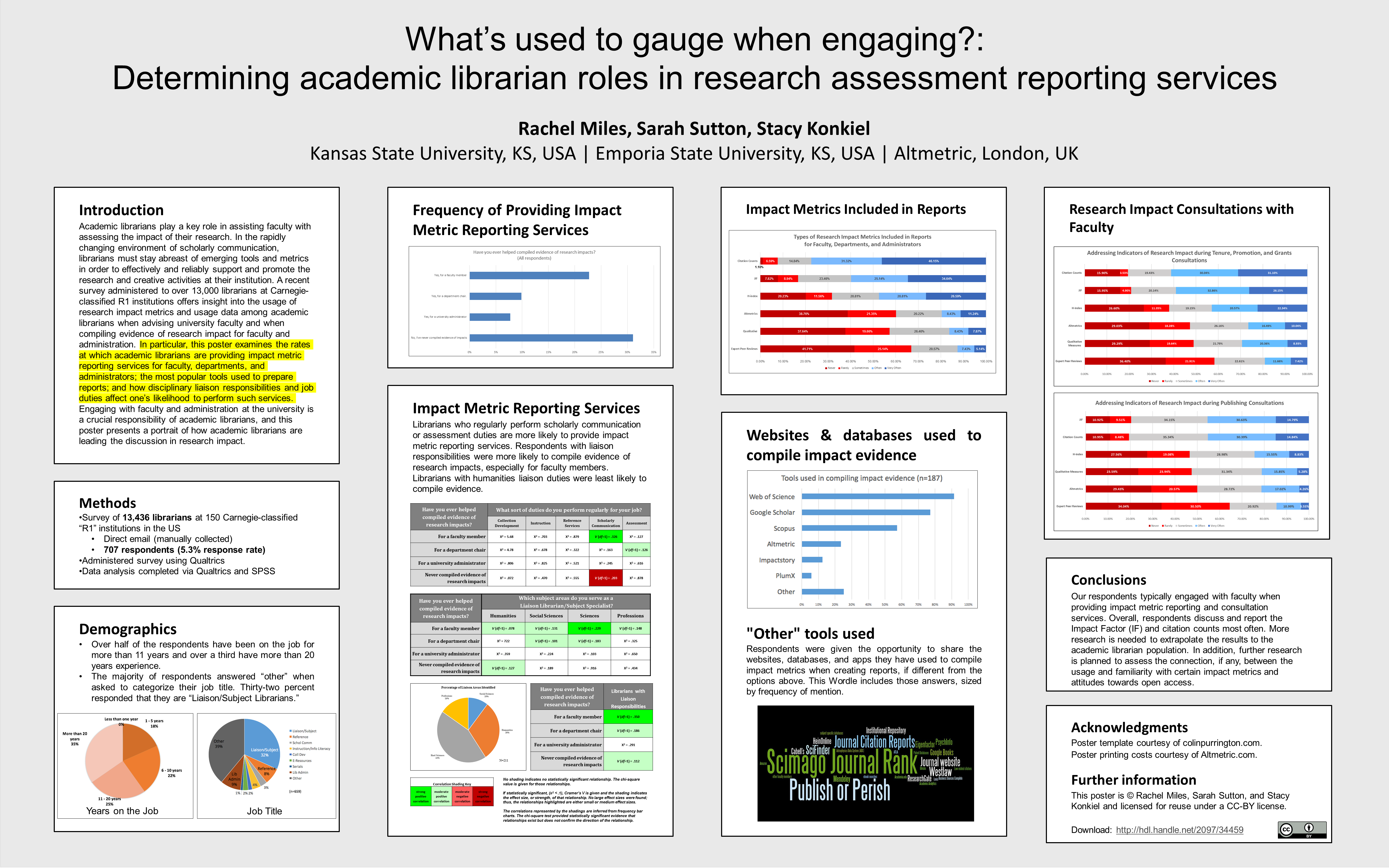 Abstract: Academic librarians play a key role in assisting faculty with assessing the impact of their research. In the rapidly changing environment of scholarly communication, librarians must stay abreast of emerging tools and metrics in order to effectively and reliably support and promote the research and creative activities at their institution. A recent survey administered to over 13,000 librarians at Carnegie-classified R1 institutions offers insight into the usage of research impact metrics and usage data among academic librarians when advising university faculty and when compiling evidence of research impact for faculty and administration. In particular, this poster examines the rates at which academic librarians are providing impact metric reporting services for faculty, departments, and administrators; the most popular tools used to prepare reports; and how disciplinary liaison responsibilities and job duties affect one’s likelihood to perform such services. Engaging with faculty and administration at the university is a crucial responsibility of academic librarians, and this poster presents a portrait of how academic librarians are leading the discussion in research impact.