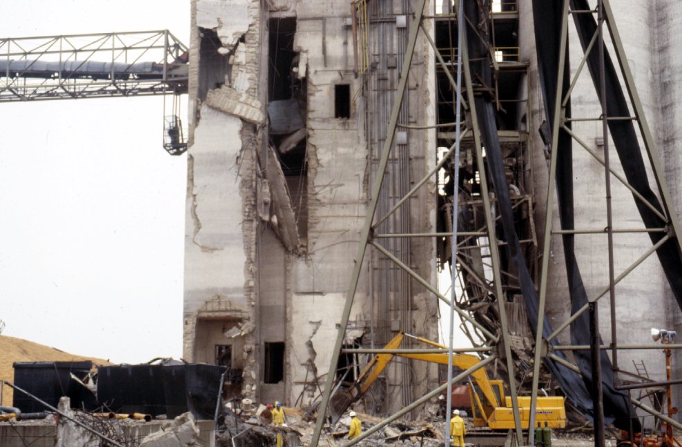 A two-story metal building attached to the headhouse is totally destroyed. It housed the elevator control room on the 2nd floor and a maintenance and repair shop at ground level. Two employees were killed and one woman survived.