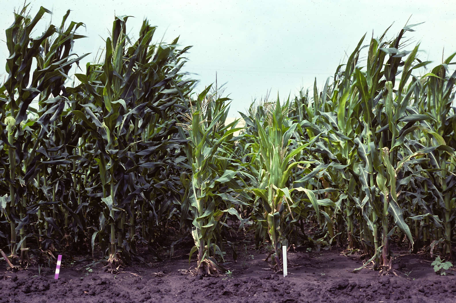 Effect of inoculation at the 6-leaf growth stage on disease severity. The hybrid Mo17 X B73 (beyond purple stake) was singularly inoculated with MCMV. Hybrid A619 X A632 (center) was inoculated with MCMV and MDMV. Hybrid Mo17 X B73 (on right) was the healthy control.