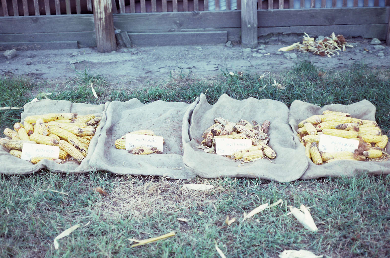 Effect on yield when various growth stages of corn plants were inoculated with CLN. From left; control (healthy plants); second, plants inoculated at 3-leaf; third, plants inoculated at 6-leaf; fourth, plants inoculated at silk.