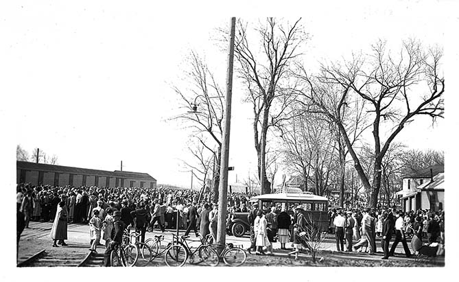 Crowds waiting to see Union Pacific stream-lined train in Manhattan, KS, April 10, 1934