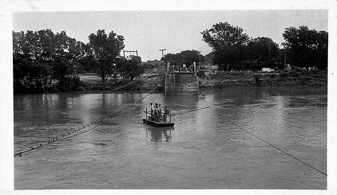 Ferry boat remaining between east pier of bridge and the remaining section of bridge, Manhattan, KS June 1935