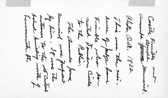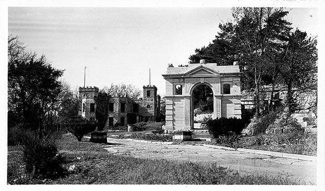 Entrance to once a school building north of Leavenworth St with the Castle Kimble and Amanda Arnold Memorial in the background, October 1932