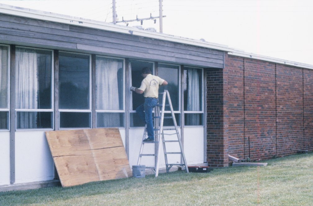 Replacing broken window across the highway.