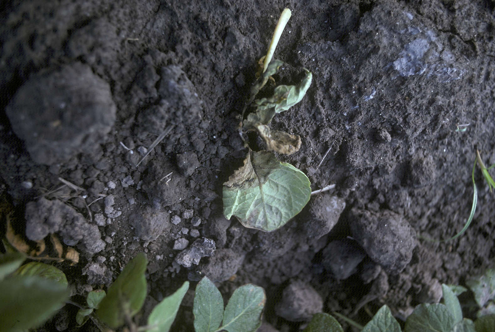 A young plant that was killed by late blight. Leaf, stem, and tuber tissue are parasitized by this fungus.