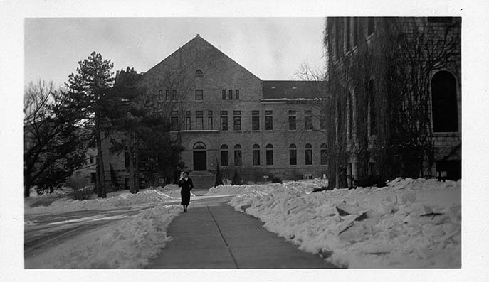 Person walking on walkway surrounded by snow away from Fairchild Hall next to Anderson Hall on the right