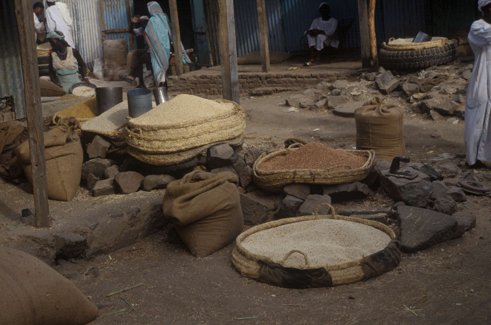 Wad Medani, Sudan: A food market that emphasized sorghum grain. Note the various sorghum types.