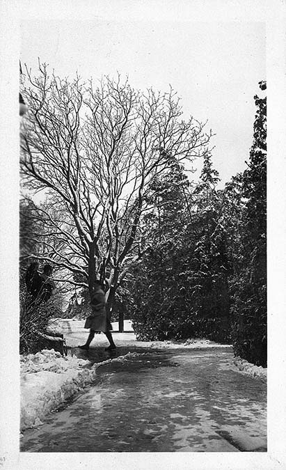 Person walking through a snow covered Kansas State Agricultural College campus