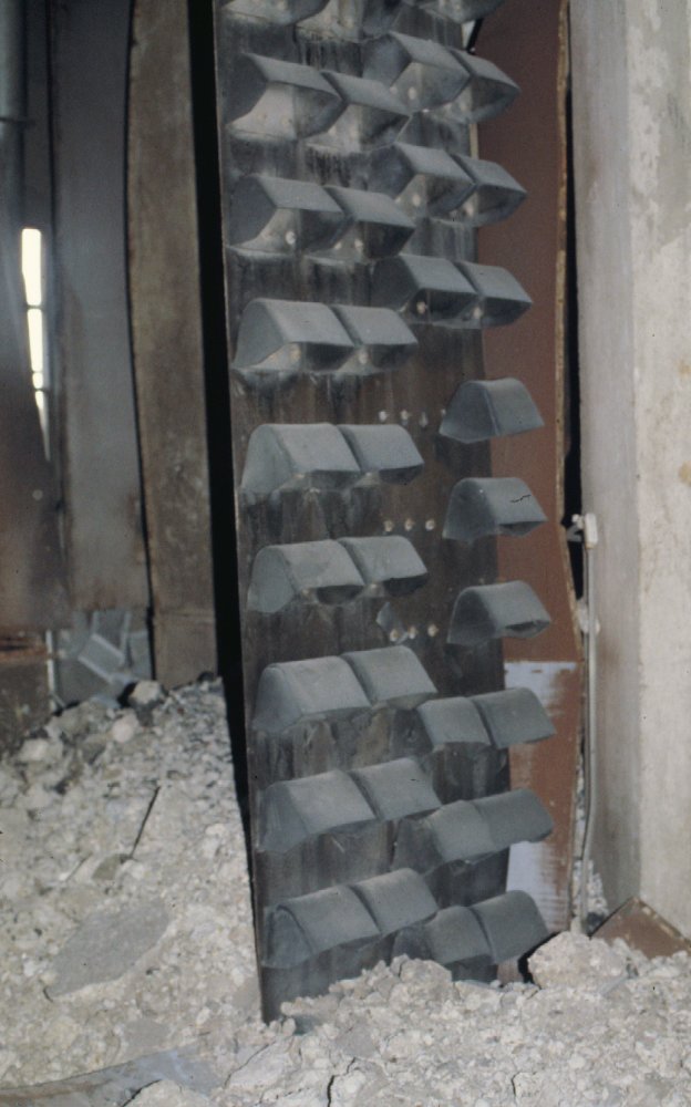 One of the bucket elevators on the work floor with concrete housing destroyed.