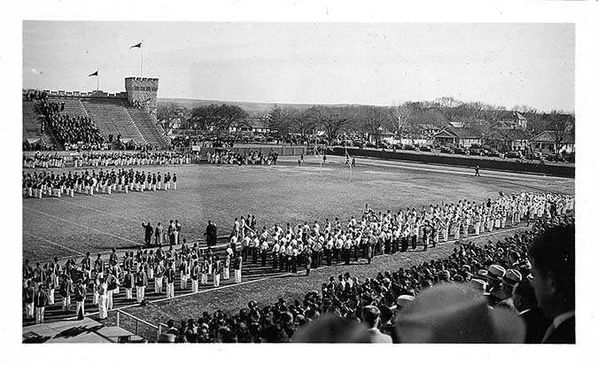 High school bands waiting on the sidelines to perform on the field at Kansas State Agricultural College Memorial Stadium